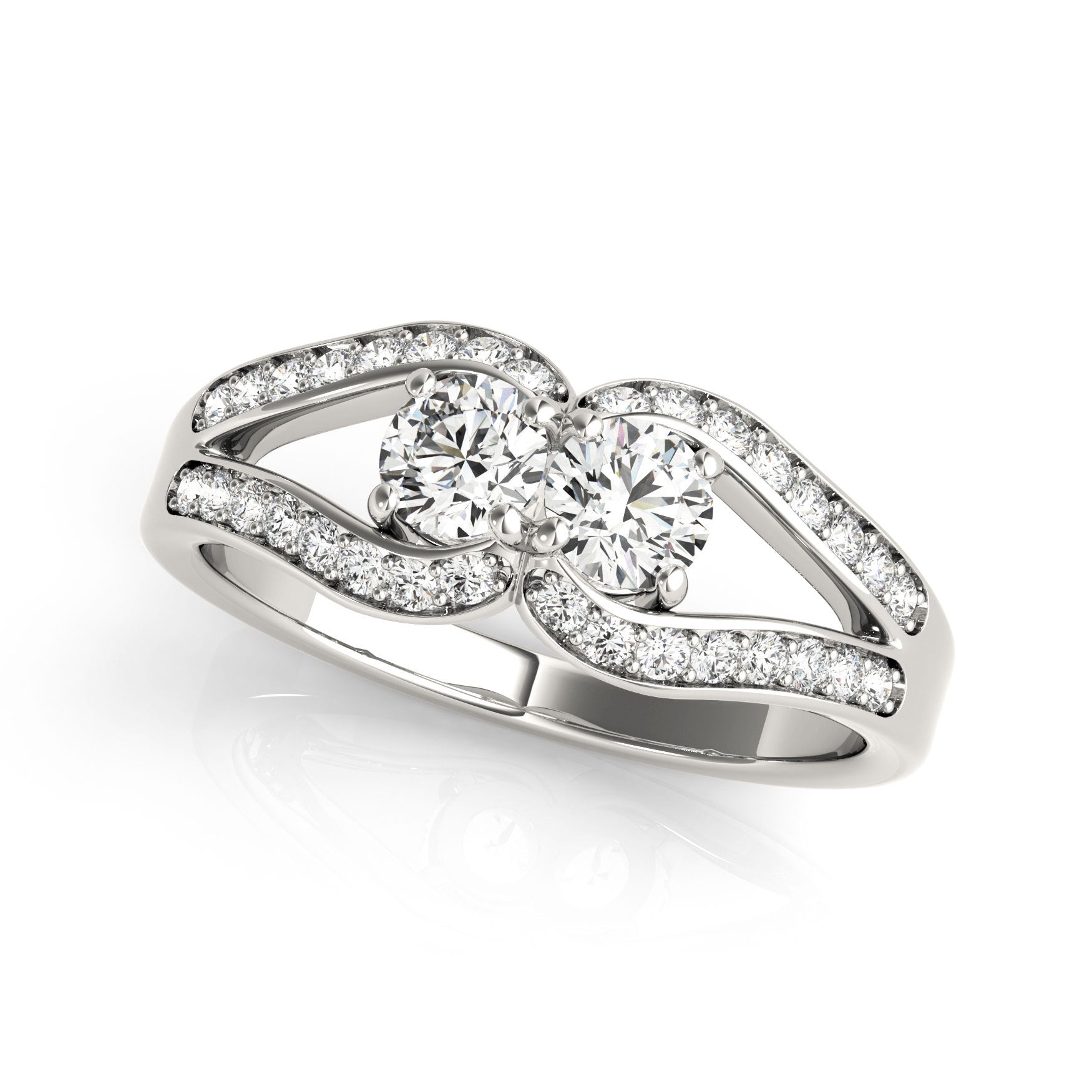 Sophisticated ring featuring 32 small round diamonds and 2 larger round diamonds, crafted in precious metal.