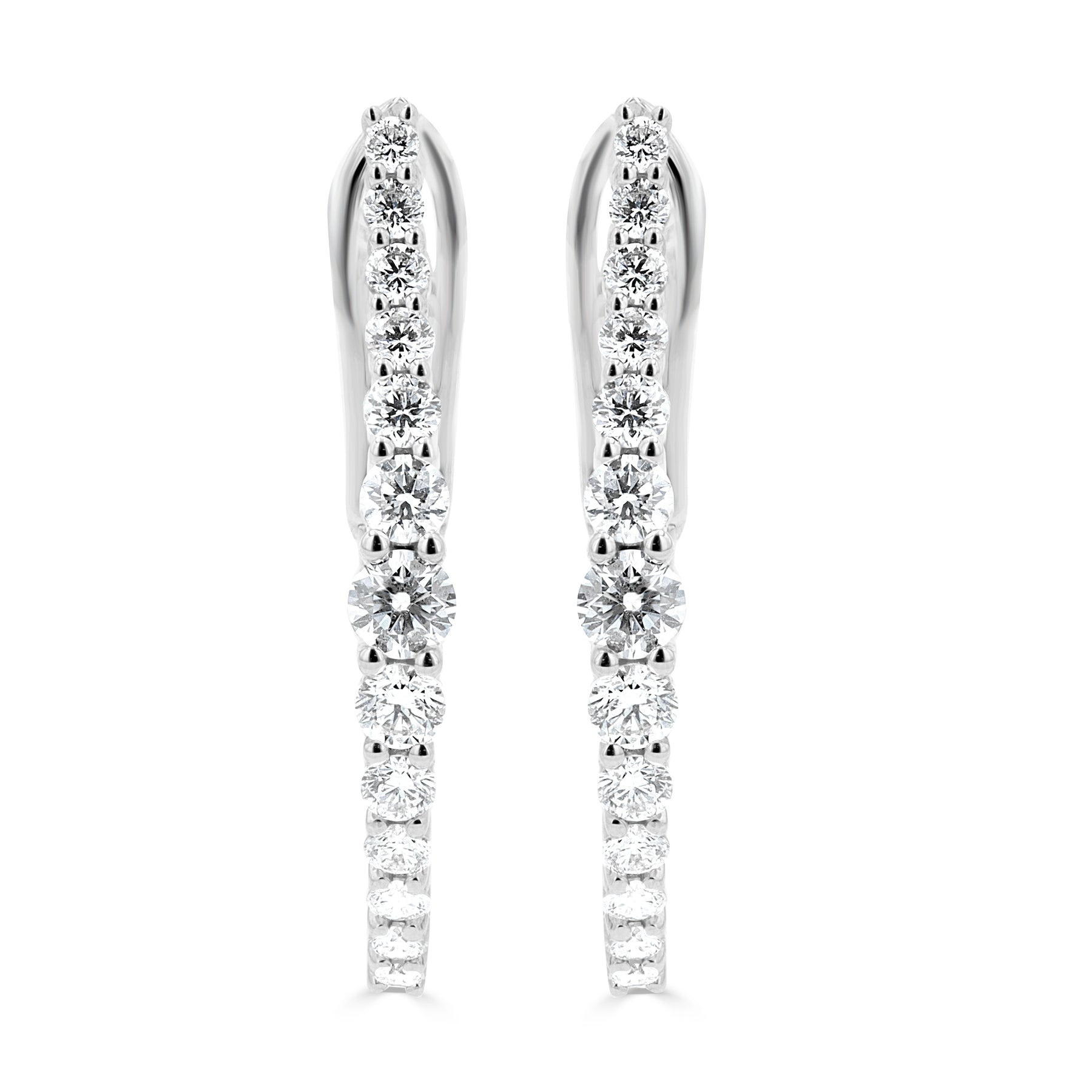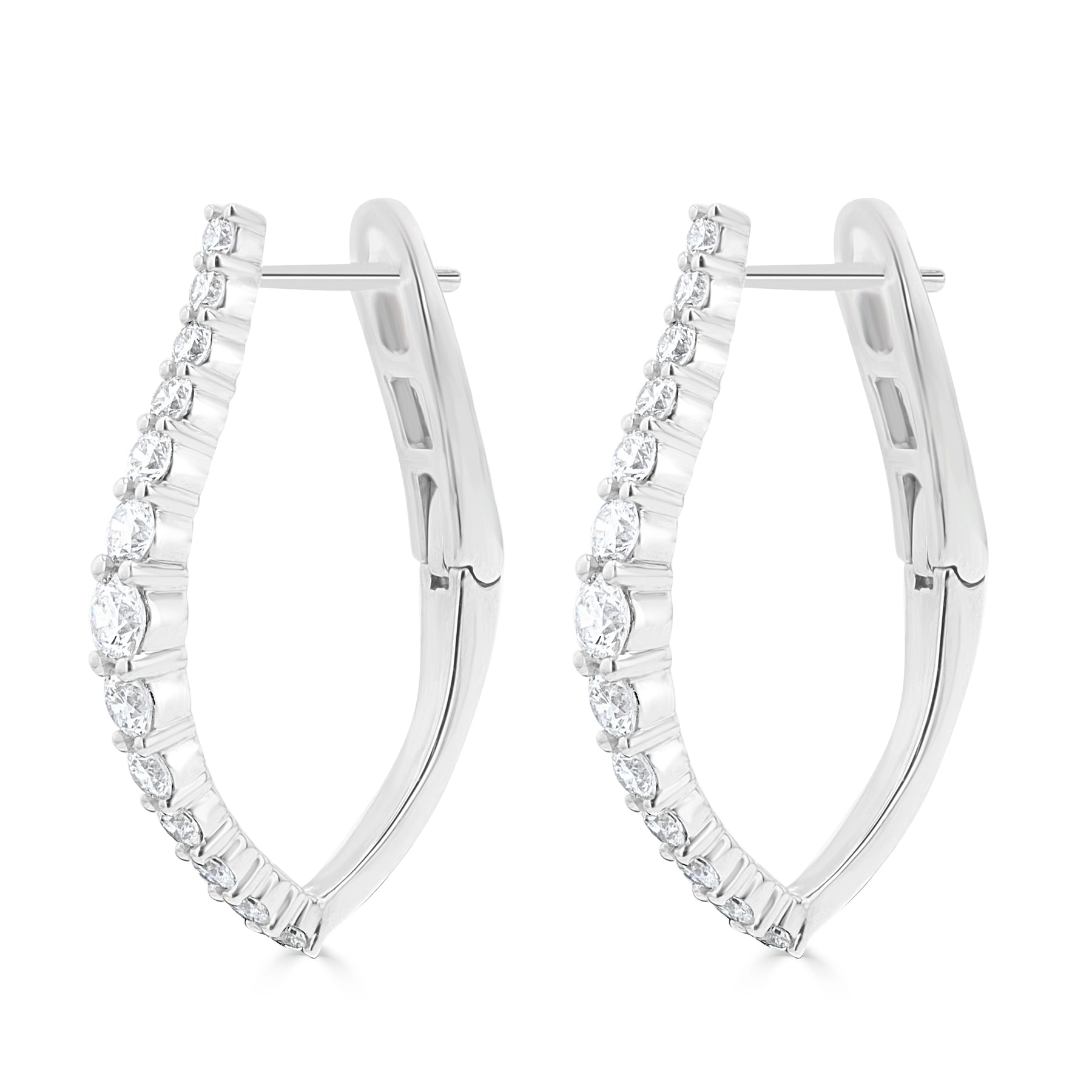 These elongated graduated "V" shape diamond hoop earrings are made in 18 karat white gold. The earrings consist of twenty-six (26) round brilliant-cut natural diamonds with a combined weight of 1.03 carats, graded H-I in color and SI in clarity. The diamonds vary in sizes to deliver a graduated style. The earrings feature a lever back for secure wear.
