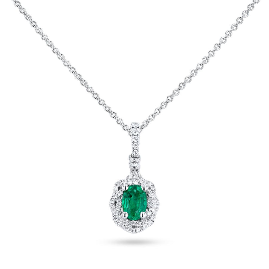 18kt White Gold Oval Emerald & Diamonds Pendant Emerald=.56cts t.w. & 42 Round Brilliant Diamonds=.13cts t.w.
