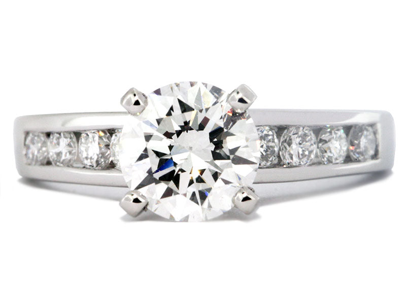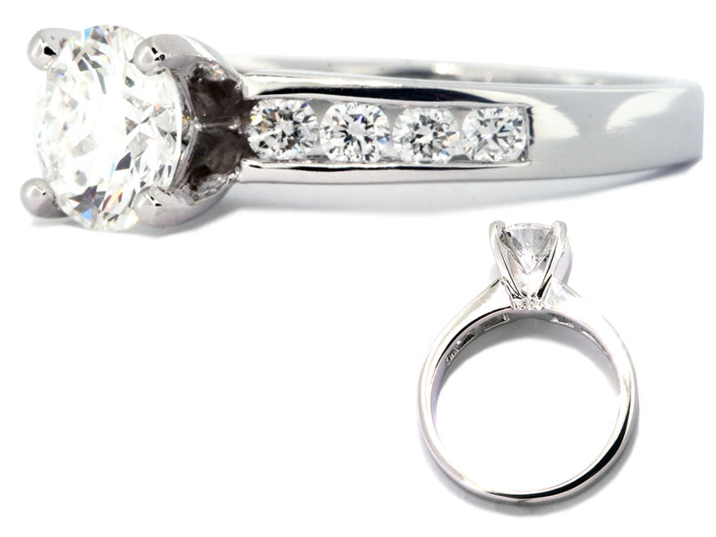 This channel-set diamond engagement ring setting is made in platinum. The mounting features a four-prong head to secure the center diamond. The band features eight (8) round brilliant-cut diamonds with a total weight of 0.45 carats. The diamonds are graded F-G in color and VS2-SI1 in clarity.