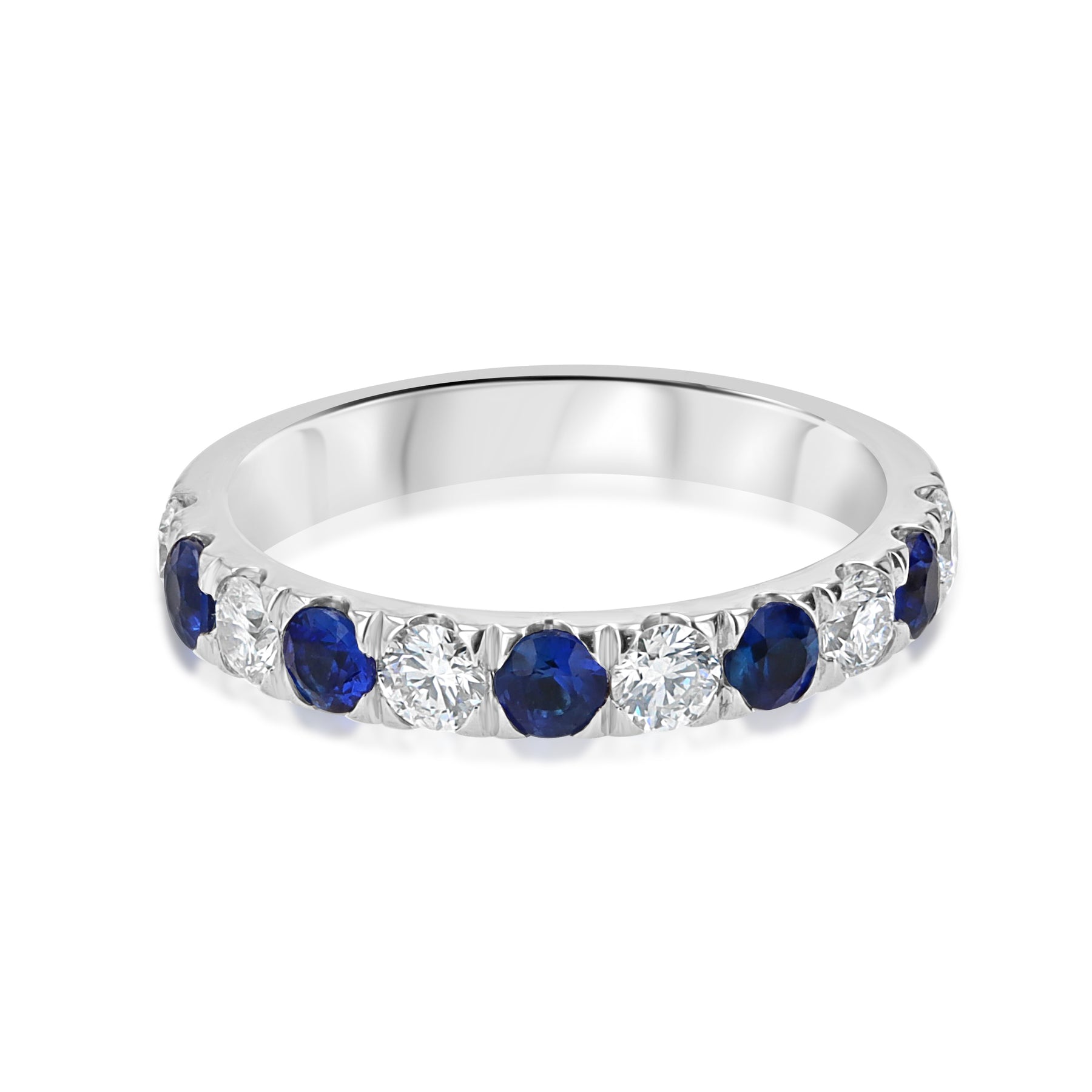 This elegant band is crafted in 14 karat white gold and features a striking alternating pattern of sapphires and diamonds. Set with five (5) round brilliant-cut blue sapphires weighing a total of approximately 0.62 carats and six (6) round brilliant-cut diamonds weighing approximately 0.60 carats in total, the design offers a beautiful balance of color and sparkle.