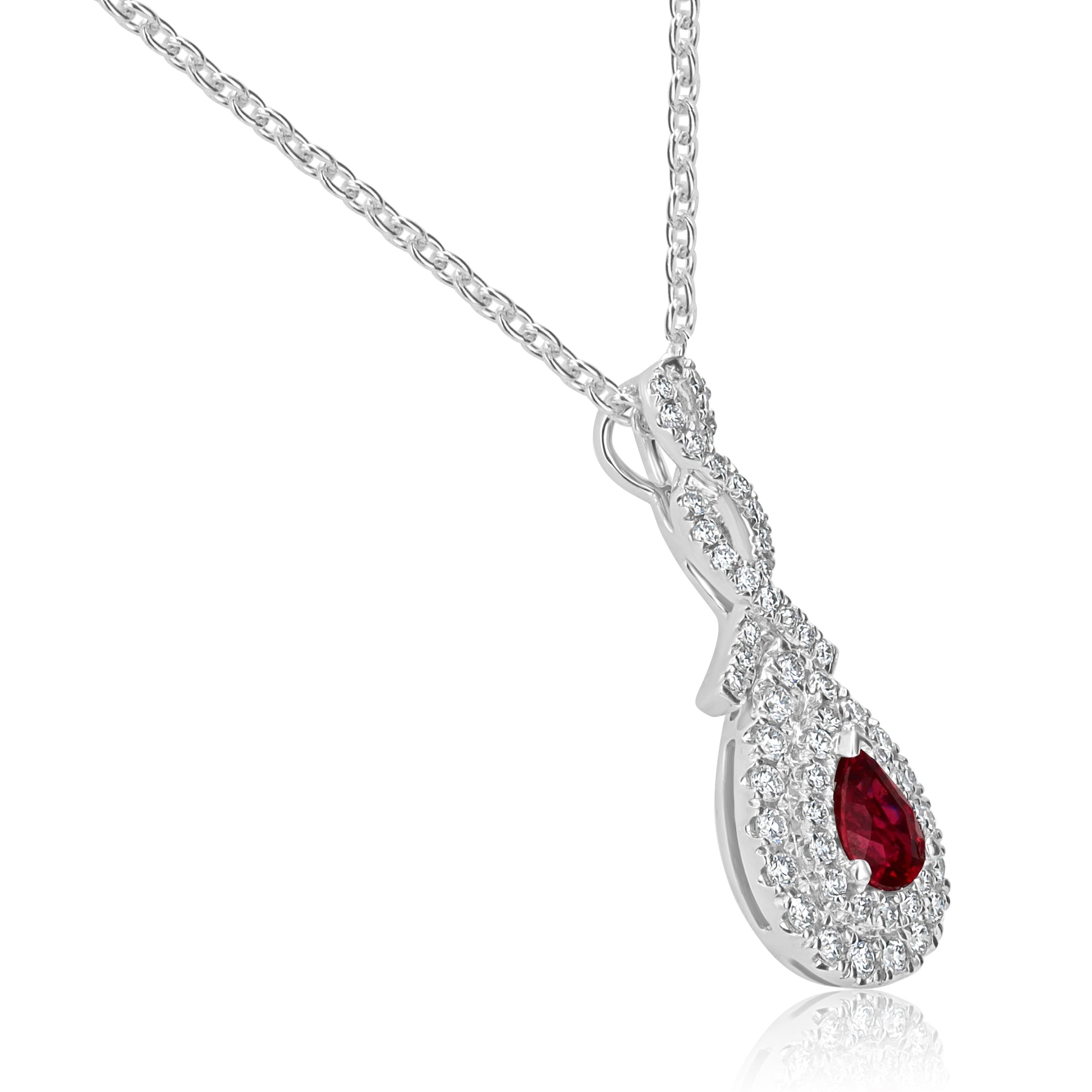 This elegant pendant showcases a vibrant pear-shaped ruby weighing 0.44 carats, gracefully accented by fifty-five (55) round brilliant-cut diamonds totaling 0.33 carats. The gemstones are set in luminous 18-karat white gold, creating a refined balance of color and sparkle. The design highlights the ruby’s rich red hue, surrounded by delicate diamonds.