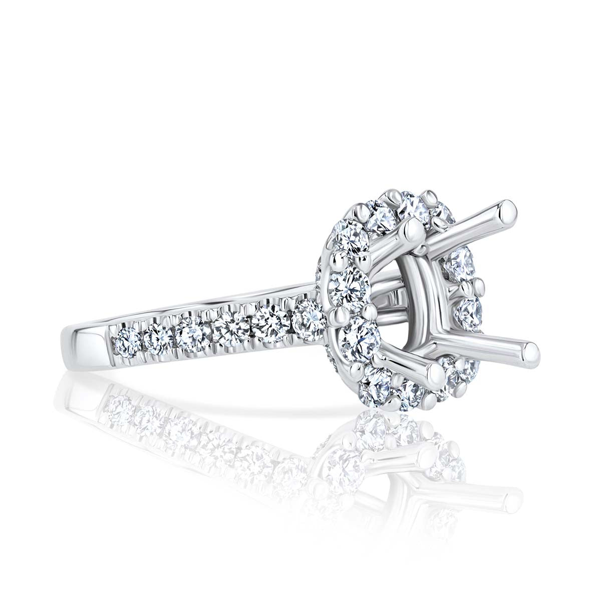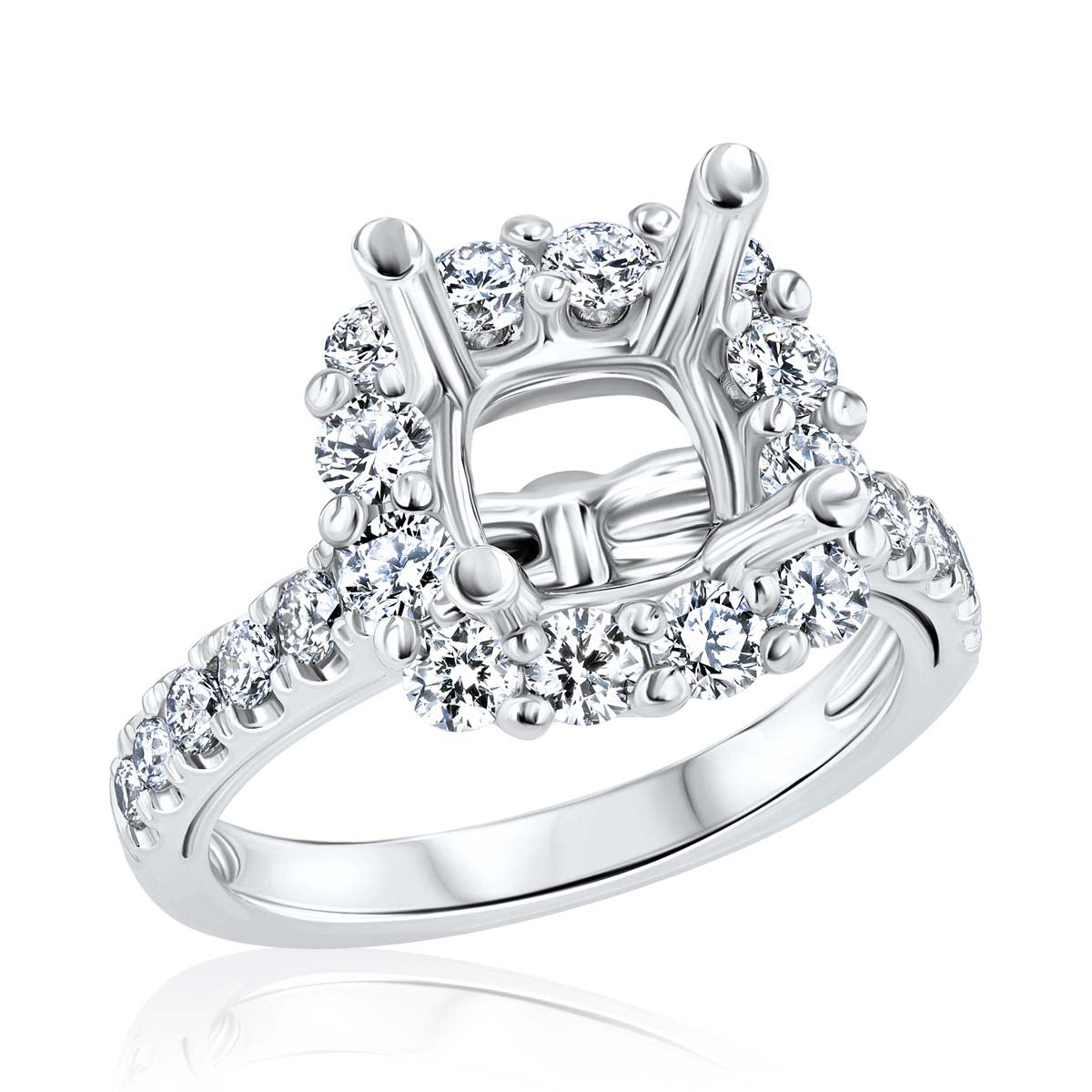 This single-row halo diamond engagement ring mounting is made in 18k white gold. The mounting features forty-six (42) round brilliant-cut diamonds with a total weight of 1.37 carats. The diamonds are graded G in color and VS in clarity. The ring also features diamond detailing under the halo. Ideally for a Cushion-Cut or similar gemstone Can be used with a Round Center