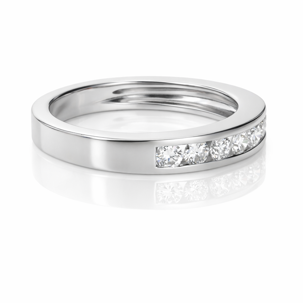 Crafted in luxurious platinum, this elegant channel-set wedding band showcases eight (8) round brilliant-cut diamonds with a total gemstone weight of 0.40 carats. The diamonds are graded F–G in color and VS2–SI1 in clarity, offering a bright sparkle and refined quality. Measuring 3.5mm wide, the band features a smooth channel setting that protects each diamond while creating a clean, modern look. Finished with a high-polish platinum surface, this timeless wedding band is designed for everyday wear and lasting beauty. To complete the set, search for the matching engagement ring, style #365597.