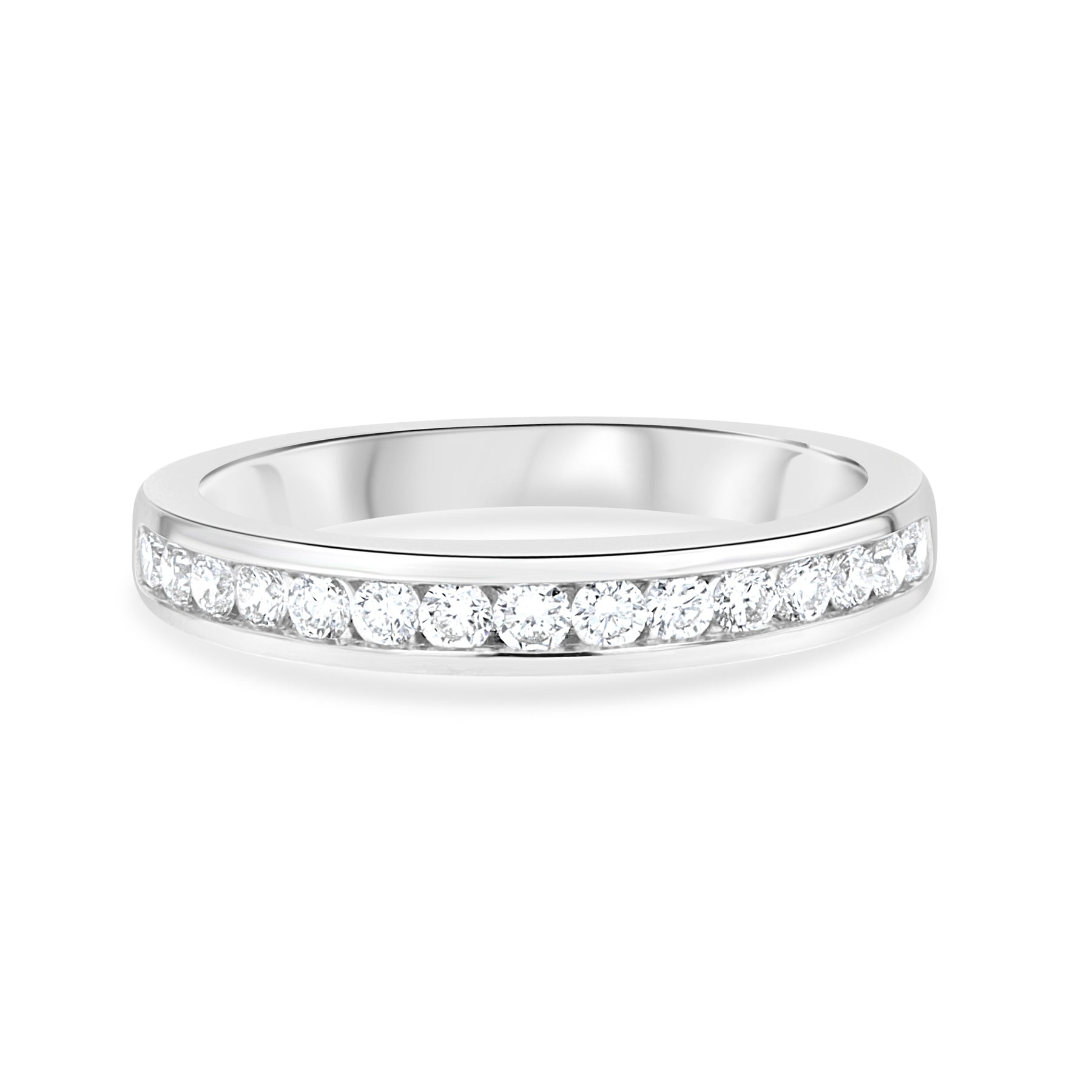 This 14 karat white gold channel-set wedding band is adorned with sixteen (16) round brilliant diamonds totaling 0.37 carats, offering a timeless and elegant sparkle perfect for everyday wear or pairing with an engagement ring.