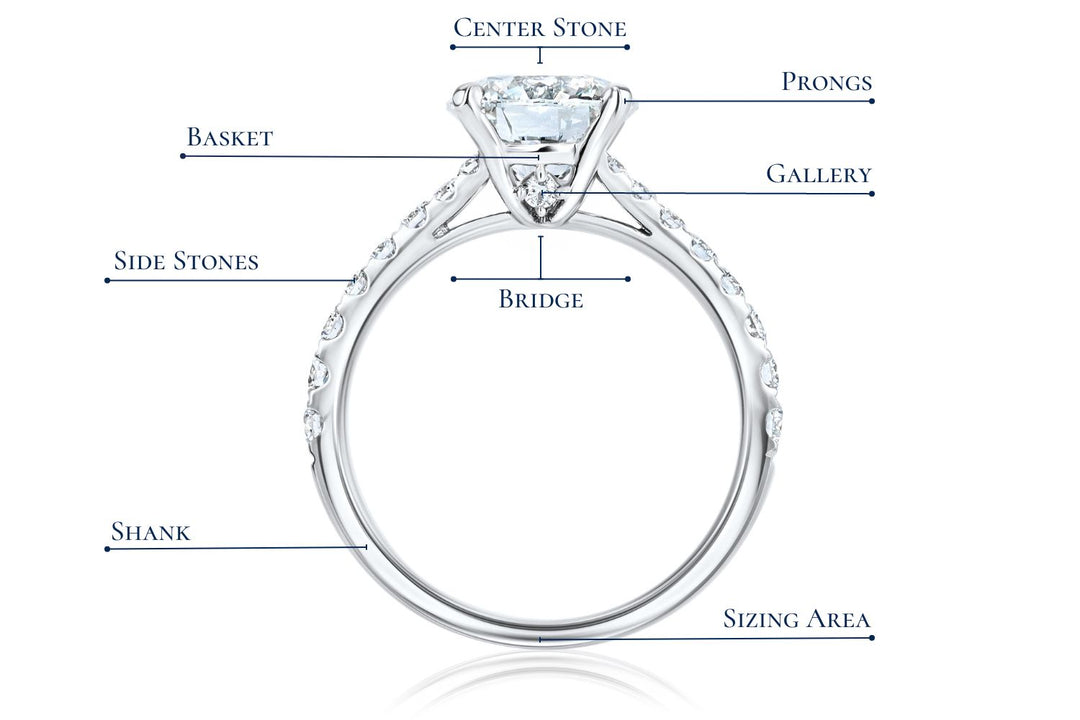 Let's walk through the various parts of an engagement ring, describing each part and its purpose: