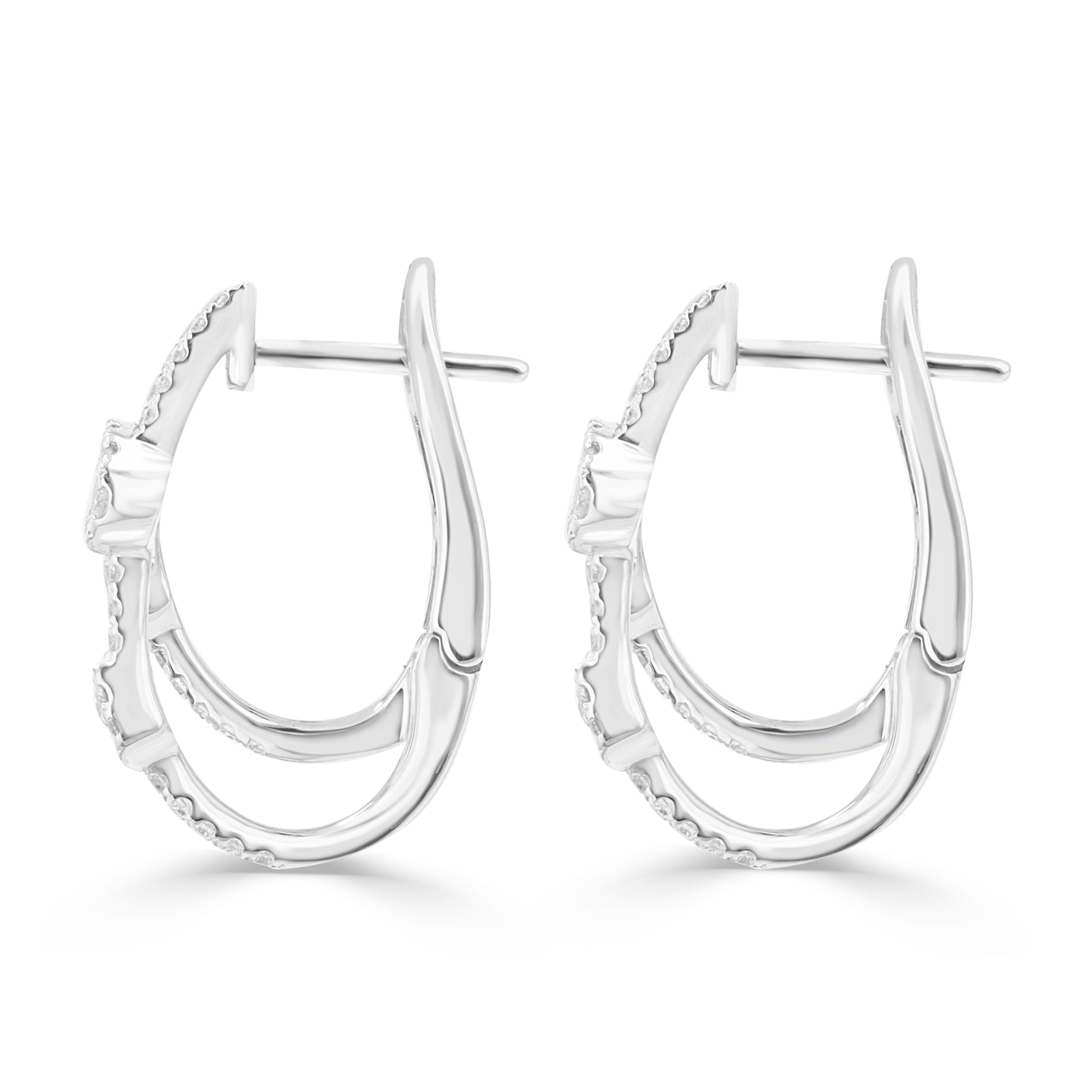 These scattered raindrop double hoop diamond earrings are made in 18 karat white gold. The earrings consists of eighty-two (82) round brilliant-cut diamonds with a combined weight of 0.55 carats, graded H-I in color and SI in clarity. The earrings have a double hoop feature, accented by pear-shaped diamond clusters down the hoops. The earrings feature a lever-back closure for secure wear.